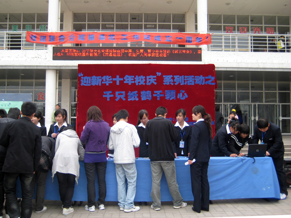 4月8日中午,由药学院团总支组织的喜迎新华十年校庆系列活动之——“千纸鹤千颗心”活动在工大食堂广场圆满结束。