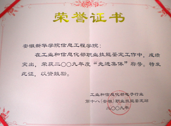 近日,信息工程学院在工业和信息化部职业技能鉴定工作中,成绩突出,荣获2009年度“先进集体”称号。