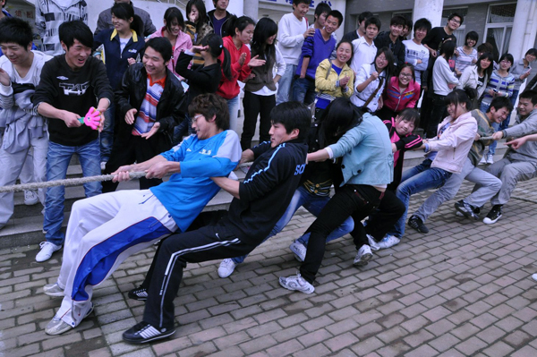 近日,文化与新闻传播学院团总支学生会在学院楼下举行了一场拔河比赛。09级各班级同学都踊跃参加,部分老师观看了比赛。