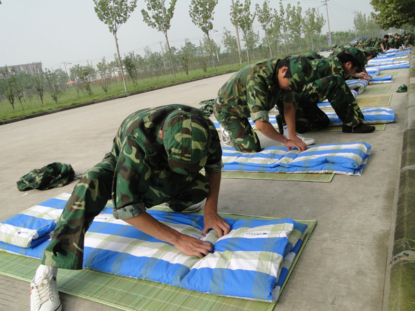 在训练场上,教官们细致讲解被褥折叠技巧,同学们认真做折叠练习;在宿舍,教官们从书桌整理、鞋子摆放、毛巾晾挂、水杯牙刷朝向等方面一一作了示范,同学们按照教官的要求统一整理,统一规范。