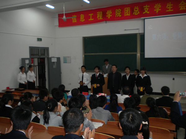 随后,行政秘书宣读了上届优秀干部名单,院长助理为他们颁发了荣誉证书。接着,团总支书记朱老师宣读了本届学生会干部和干事名单。吴恒修院长和汪强主管为新一届的学生会干部颁发了任职聘书。