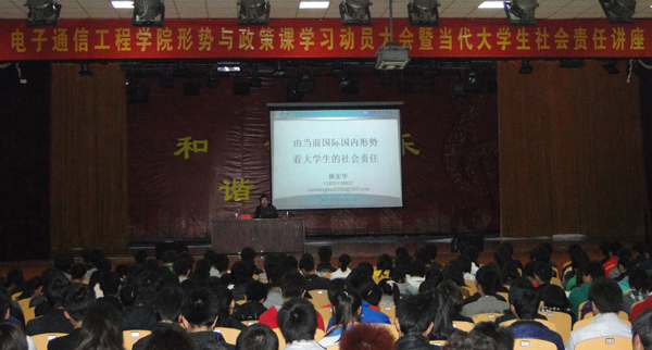 3月31日晚,电子通信工程学院在学院大礼堂召开了形势政策课学习动员大会,电子通信工程学院行政副院长操宏华做动员讲话并做主题报告。电院学生会、助理团同学以及各班级的班干、信息员约500人参加了大会并听取了报告。