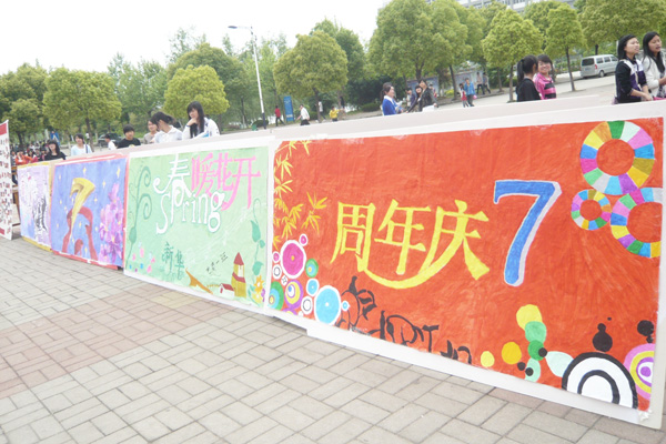 阵阵激情而又动感的音乐在翰林广场回响,大家纷纷驻足关注。广场上一幅幅色彩缤纷、精美而又富含寓意的板报及周年庆典图片吸引了往来学生的注意力。其中2010级国际经济与贸易2班的板报以其鲜艳夺目的红色为底色,两旁盛放夺目的烟火为基调,意在商学院七周年庆典万众期待。往来的行人在欣赏完一幅幅精美的板报及往年的周年庆典图片展后,都纷纷称好,并纷纷向在场工作人员打听晚会的具体举办时间。