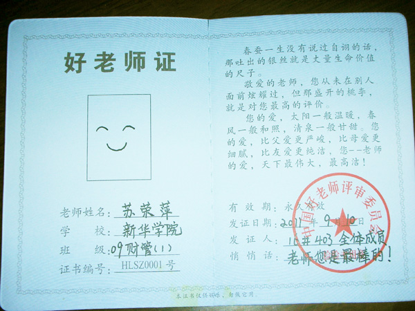 在教师节之际,商学院同学以实际行动报答恩师。同学们自办板报,独具匠心设计“好老师证”,亲手写出对老师教诲、教授的感恩之情。学生们还手捧鲜花,为自己的老师们送上鲜花和真诚的祝福:“老师,您辛苦了!祝老师节日快乐”。 质朴的言语表达了学生对老师真诚的爱,同学们的心意让这个属于老师们自己的节日更加绚丽!老师们纷纷表示:要履行职责、奉献智慧、播种希望、培养栋梁。