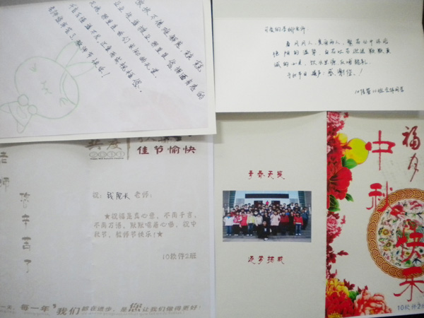 9月9日早上,当老师们走进教学楼时,信息工程学院助理团的同学们为老师们精心准备了包装好的糖果盒,每个盒子里都有一张写着祝福语的卡片,通过这种方式表达了同学们的感激和祝福之情,同学们面带笑容,向每位到来的老师说:“老师,您辛苦了,祝您节日快乐”。 结合信息工程学院专业知识,2010级软件2班的同学们还自己设计,做出印有全家福的中秋贺卡。学生会同学还为老师们准备了精美的卡片,为每位老师画了不同的简笔画,希望给老师们带去快乐。
