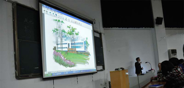 讲座还没开始,教室内就已经挤满了人,同学们就激情高涨,讲座过程中两位设计师分别从工作经验、创作技巧方面给学生们做讲解。刘超老师把自己多年的作品拿出来讲解分析,并结合自己在创作实践,让大家了解手绘创作时应该注意艺术和技法,他还对室内设计的前景做了展望。谭飞老师和大家分享了他做室内设计师的体会和心得。在谈到手绘时,他说:“手绘能使设计师与客户有更好的沟通,能让客户直接客观的了解我们的能力,进而为客户设计出他想要的或是最合适他的作品。”强调学好手绘一定要开阔自己的眼界,提高自己的审美能力。