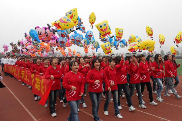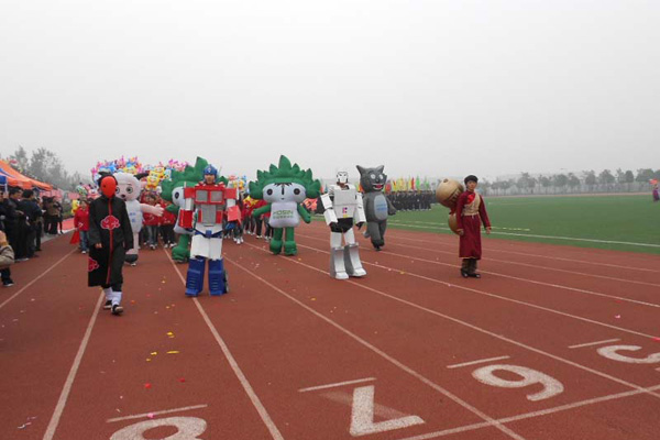 “激昂动漫,辉煌灿烂;奋力拼搏,勇夺桂冠!”在同学们的掌声和期待中,动漫学院方阵在动漫学院行政副院长朱诵贵,动漫学院院长助理许存福和动漫学科带头人刘国宏的带领下昂首阔步地走向主席台。方队由200名学生组成,“福娃”“机器人”“喜洋洋与灰太狼”等卡通人物形象的出现成为整个运动会场的一大亮点,而每个学生手中的卡通人物形象也各具特色。这样一个具有动漫学院特色的方阵的出现无疑将会场的气氛推向了高潮。