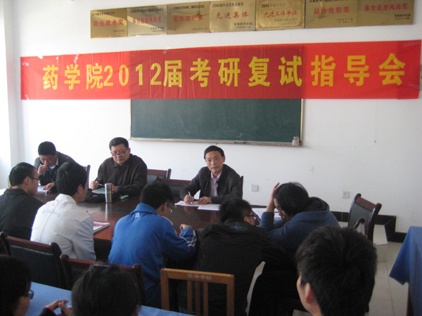 为帮助2012届毕业生考研初试成绩优异的同学顺利通过复试,4月6日上午,药学院召开考研复试指导交流会,药学院院长张国升、教学副院长宋美、行政副院长王飞、制药工程系主任张兴法、毕业班辅导员以及20余名考研学子参加了指导交流会。
