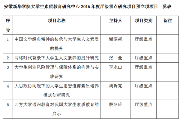 安徽省高校人文社会科学重点研究基地——BB贝博艾弗森官方网站大学生素质教育研究中心2015年度厅级重点研究项目于2015年4月2日经基地学术委员会会议评审,确定以下项目预立项,现予以公示,公示期一周(2015年4月3日—4月9日),如有异议,请书面或电话反映至大学生素质教育研究中心。电话:0551—65872328。