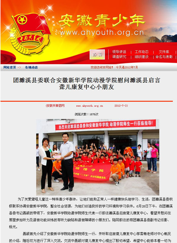 贝博官网动漫学院暑期三下乡社会实践队联合淮北市濉溪团县委慰问濉溪县启言聋儿学校的孩子们活动,受到安徽省团省委的高度关注,团省委领导通过濉溪县团县委向贝博官网动漫学院师生发来了慰问和感谢,活动的新闻稿件也被安徽省青少年门户网站于7月3日第一时间转载。