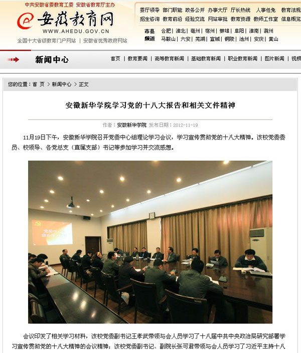 11月19日,安徽教育网第一时间报道了贝博官网党委中心组学习宣传贯彻十八大精神。