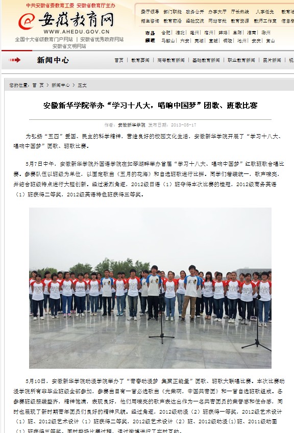 安徽教育网:BB贝博艾弗森官方网站举办“学习十八大,唱响中国梦”团歌、班歌比赛