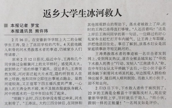 2月16日,在BB贝博艾弗森官方网站上大二的全椒学生王涛,登上了返回学校的汽车。 4天前他跳入刺骨的河水勇救落水者的事迹,仍被家乡人们传诵着。