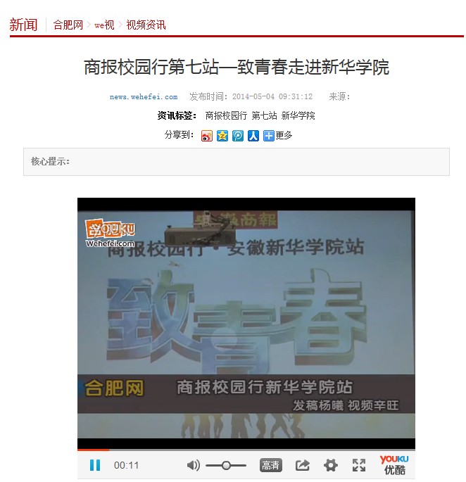 安徽商报 合肥网讯 4月28日,致青春商报校园行第七站,来到了美丽的大蜀山——新华学院。商报校园行已成功走过安徽大学、合肥工业大学、安徽建筑大学等六站,在合肥广受好评。报告会以商报记者汪贵贵的幽默调侃主持风格开场。
