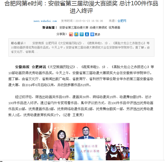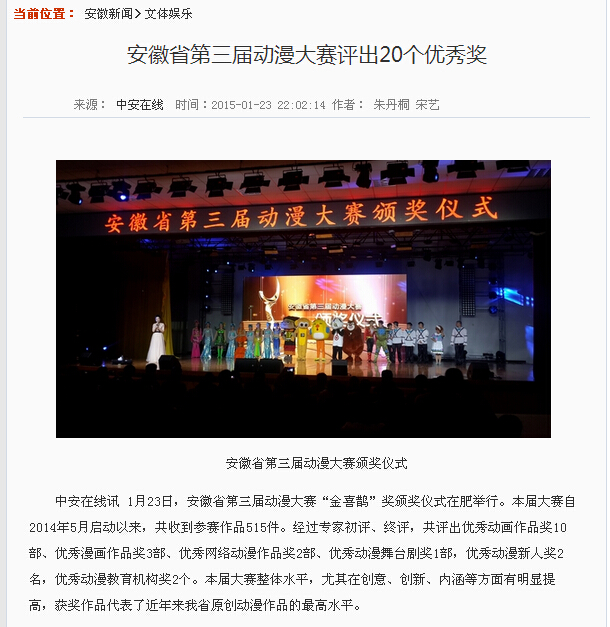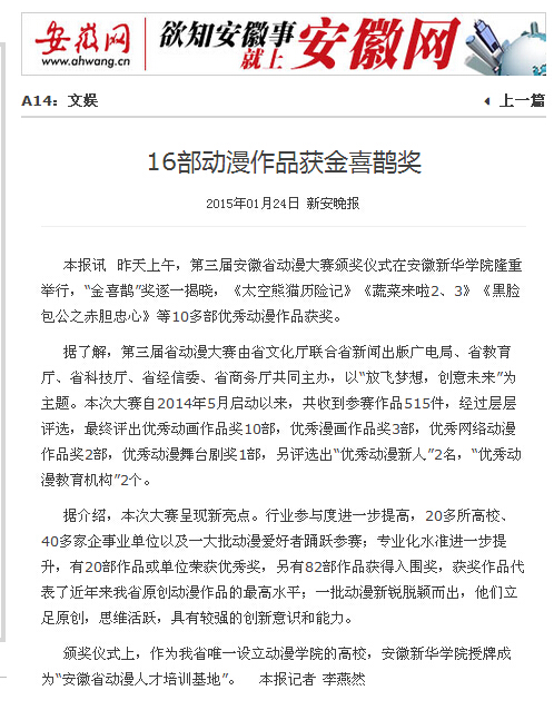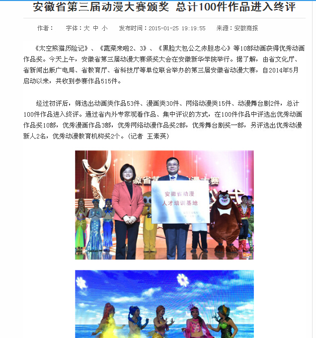 安徽日报、新安晚报、安徽商报、中安在线报道贝博官网承办安徽省第三届动漫大赛“金喜鹊”颁奖仪式