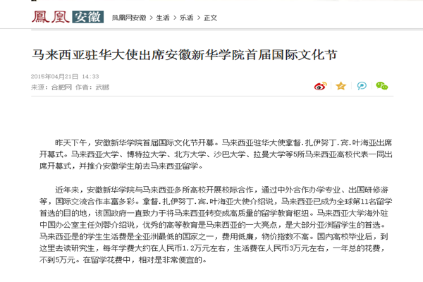 凤凰安徽:马来西亚驻华大使出席BB贝博艾弗森官方网站首届国际文化节、马来西亚五所名高校来皖揽学子 驻华大使助阵