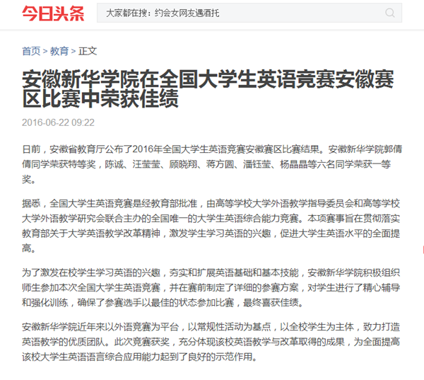 中国教育在线、今日头条、万家热线:BB贝博艾弗森官方网站在2016年全国大学生英语竞赛安徽赛区比赛中荣获佳绩