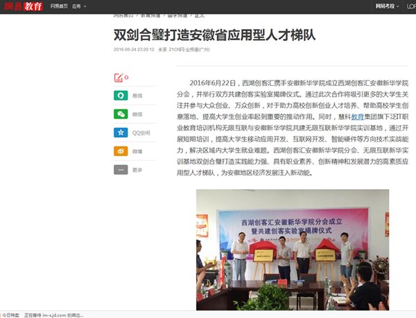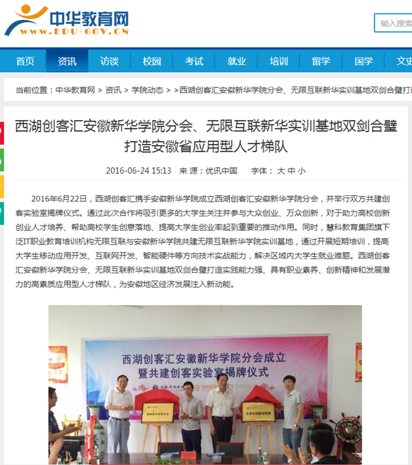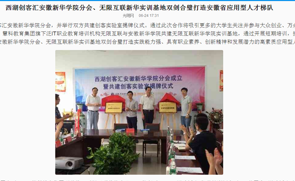 光明网、中华教育网、网易教育:西湖创客汇BB贝博艾弗森官方网站分会、无限互联新华实训基地双剑合璧打造安徽省应用型人才梯队