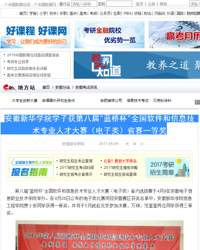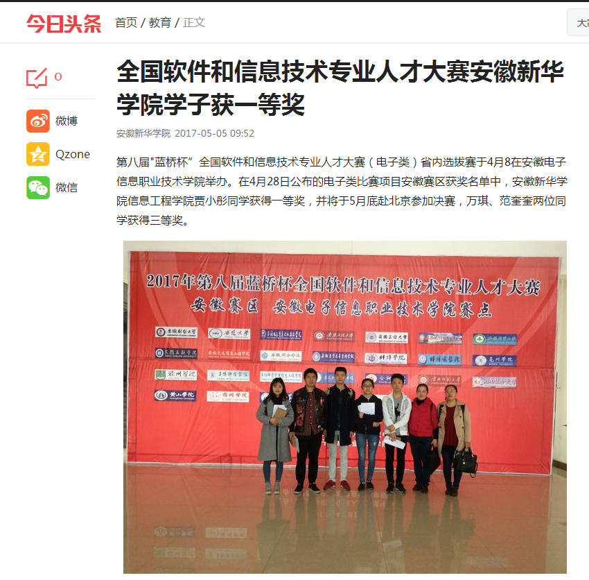 中国教育在线、今日头条:BB贝博艾弗森官方网站学子获第八届"蓝桥杯"全国软件和信息技术专业人才大赛(电子类)省赛一等奖