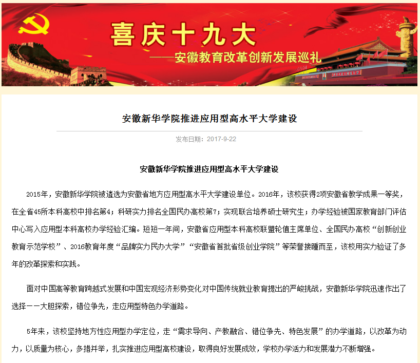 安徽教育网:BB贝博艾弗森官方网站推进应用型高水平大学建设