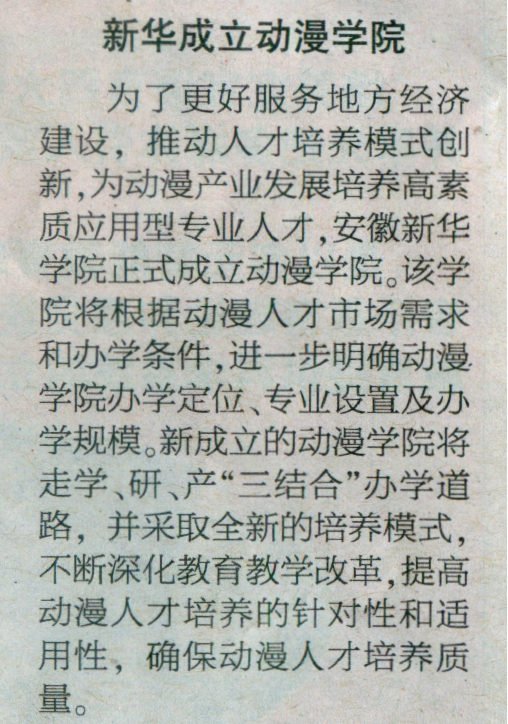 2010年4月23日,新安晚报/教育/资讯/C04版对我院动漫学院成立一事进行了相关报道。