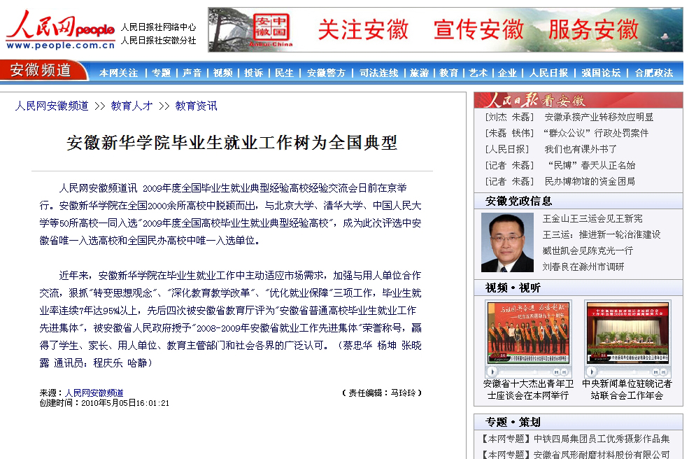 2010年5月5日,人民网安徽频道对我院入选全国高校毕业生就业典型经验高校一事进行了相关报道。