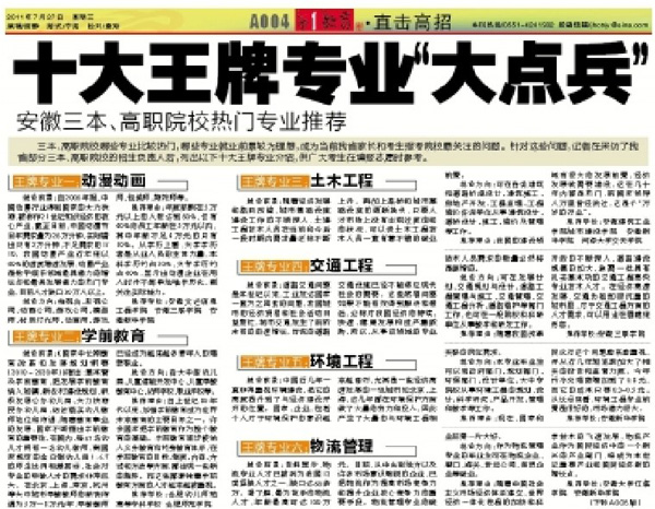 7月27日的江淮晨报B04版文章《十大王牌专业“大点兵”》列出以下三本和高职院校十大王牌专业介绍,供广大考生在填报志愿时参考。贝博官网动漫动画、土木工程、环境工程、物流管理、电子信息工程专业入选推荐高校名单。