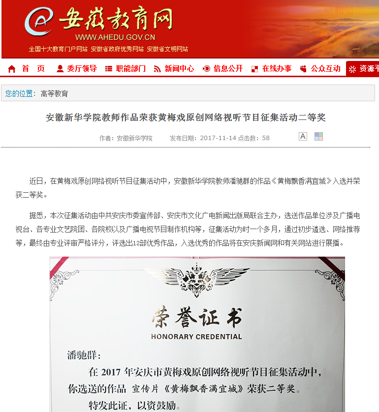 安徽教育网:BB贝博艾弗森官方网站教师作品荣获黄梅戏原创网络视听节目征集活动二等奖