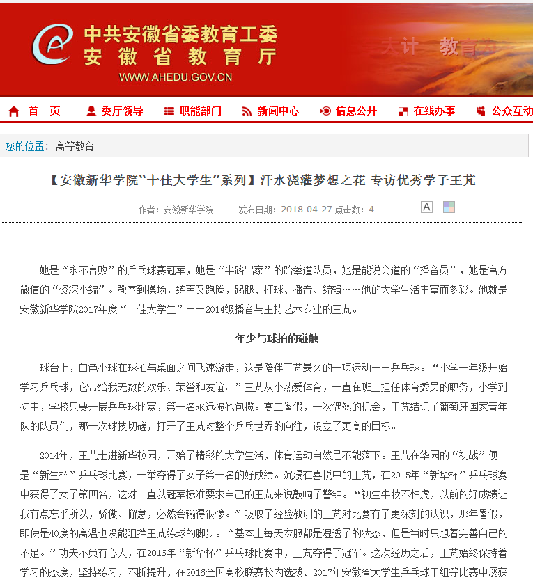 安徽教育网:【BB贝博艾弗森官方网站“十佳大学生”系列】汗水浇灌梦想之花 专访优秀学子王芃