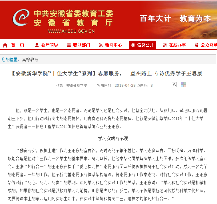 安徽教育网:【BB贝博艾弗森官方网站“十佳大学生”系列】志愿服务,一直在路上 专访优秀学子王思康