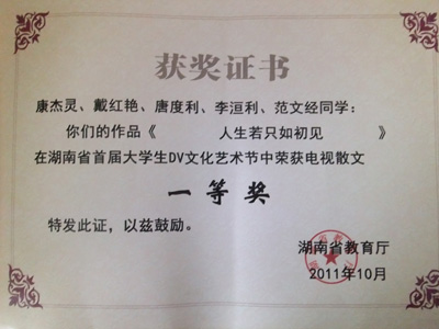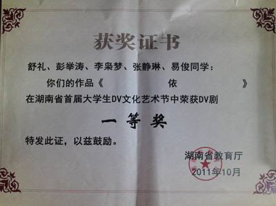 由湖南省教育厅主办的本届大学生艺术节DV文化节有全省33所高等院校104部学生DV作品参赛,我院影视系学生作品在全省高校众多学生作品中脱颖而出,一举获得多项大奖。