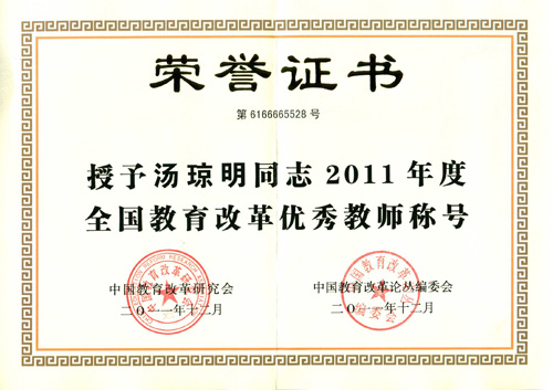 汤琼明老师获“2011年度全国教育改革优秀教师”荣誉称号