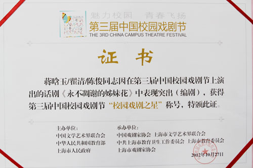 我院话剧《永不凋谢的姊妹花》摘取中国校园戏剧节大奖