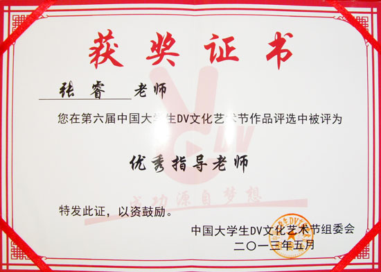 近日,从第六届中国大学生DV文化艺术节组委会传来喜讯,我院影视系参赛作品李欣蓓同学的《情聚振华》获得专业组最佳纪录片奖,影视系青年教师张睿获得优秀指导老师奖。