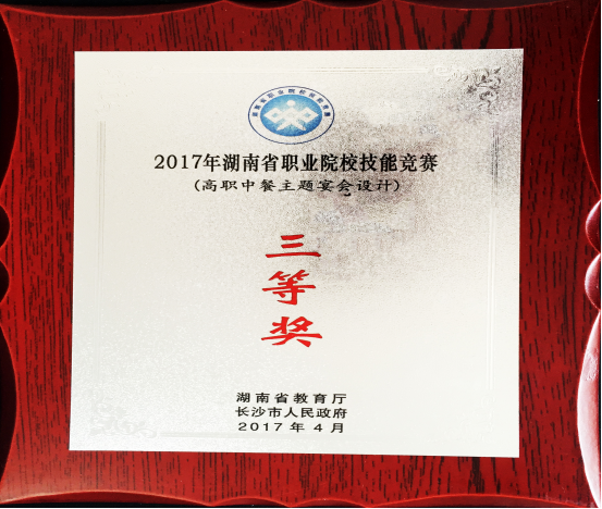 4月26日至28日,湖南省职业院校技能竞赛中餐主题宴会设计比赛在长沙商贸旅游职业技术学院举行,学院社文系2015级酒店管理班的申幸、陈莉婷、周莎莎三位同学,凭借稳定的发挥和精彩的表现,从全省高职院校的几十名选手中脱颖而出,获得三等奖,指导教师薛驰宇、李苗苗获优秀指导奖。