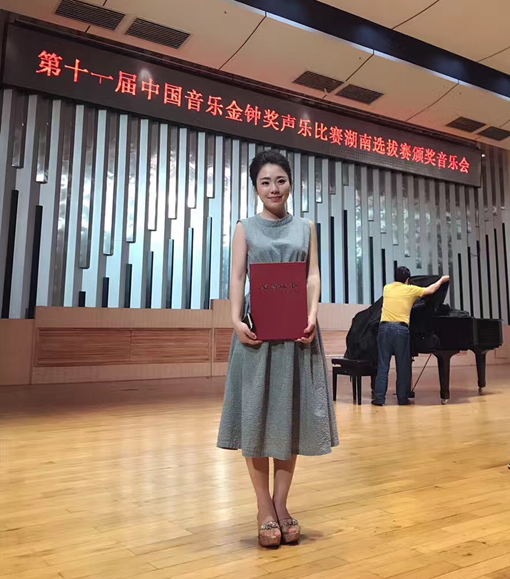 5月14日晚,第十一届中国音乐金钟奖声乐比赛湖南选拔赛颁奖音乐会在湖南省音乐厅举行,学院影视系熊曼旋老师成功进入选拔赛决赛,并获得美声组铜奖。