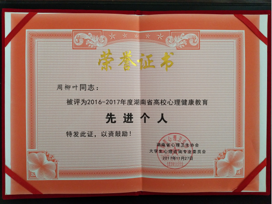 11月24日-26日,湖南省心理卫生协会大学生心理咨询专业委员会第十二届学术年会在长沙举行。会议对湖南省高校年度先进单位、先进个人和优秀社团给予了表彰。我院荣获“2016-2017年度湖南省高校心理健康教育先进单位”称号;我院心理协会荣获“2016—2017年度湖南省高校优秀学生社团”称号;学工处心育中心周柳叶老师荣获“2016-2017年度湖南省高校心理健康教育先进个人”称号。