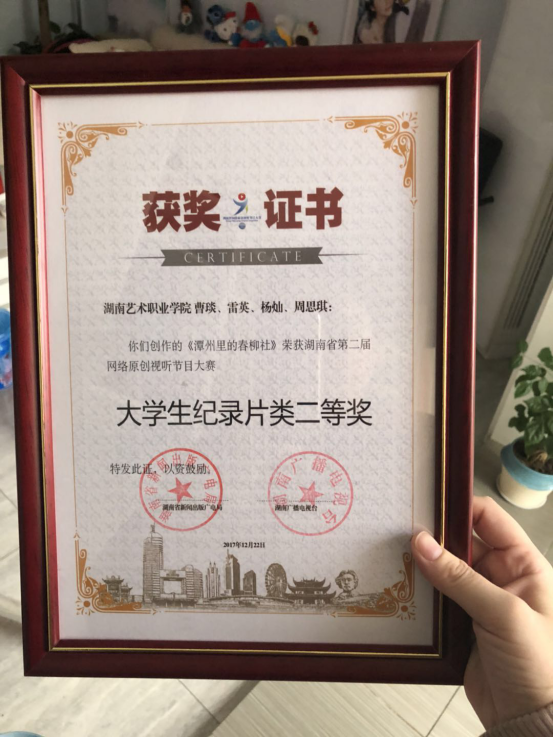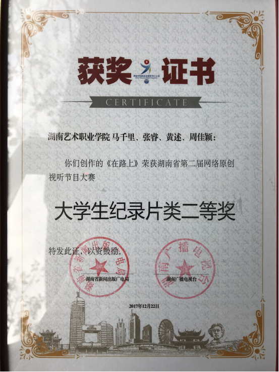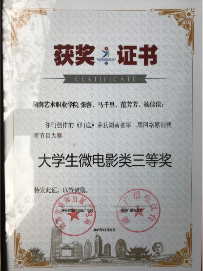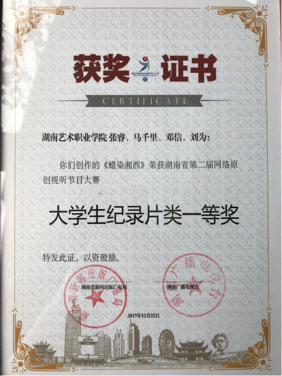 12月22日上午,湖南省第二届网络原创视听节目大赛颁奖仪式在长沙举行。我院影视系师生创作的《蜡染湘西》《在路上》《潭洲里的春柳社》等五部作品获奖,学院获优秀组织奖。院长张勇、副院长杨向东以及影视系负责人、部分获奖师生受邀参加了颁奖仪式,张勇作为颁奖嘉宾为获得“国际传播节目”奖项的两个作品颁奖。