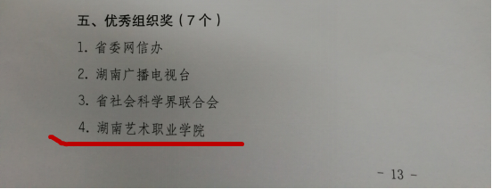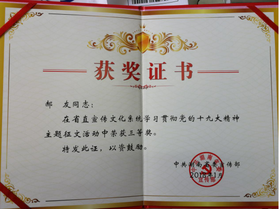 近日,省委宣传部组织开展了省直宣传文化系统“学习宣传贯彻党的十九大精神”主题征文比赛活动,我院郝友等5位同志获奖,学院获优秀组织奖。据悉,省直宣传文化系统20家单位参加本次征文比赛活动,共推荐选送237篇文章参赛。经评审,并报部领导审批,共评出一等奖体会文章10篇,二等奖体会文章16篇,三等奖体会文章21篇,优秀奖体会文章66篇,优秀组织奖7个。省委宣传部透露,各单位的班子成员都没有参与评奖。