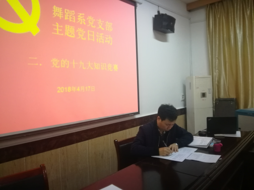 本学期开学以来,舞蹈系支部党员充分利用课余时间认真自学了“党的十九大精神应知应会300题”、“新时代面对面”等资料,坚持用党的十九大精神武装头脑,指导系部教育教学工作开展。