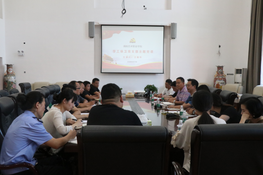 9月19日下午,学工保卫党支部在综合楼208会议室召开支部党员大会,学院党委书记王章华出席会议,并以“建设艺术学院、服务文化强省”为主题,为与会的党员上了一堂生动的党课。会议由学工保卫党支部副书记周春主持。