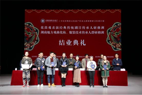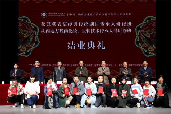 11月28日下午,由文化和旅游部、教育部、人力资源和社会保障部主办,湖南省文化和旅游厅指导,威廉官网中国官方网站承办的“花鼓戏表演经典传统剧目传承人研修班”和“湖南地方戏曲化妆、服装技术研修班”在学院松雅校区实验剧场举行结业典礼。湖南省文化和旅游厅党组成员、副厅长张帆,厅非遗处负责人陈友材、调研员肖正湖、副调研员向蓉蓉,威廉官网中国官方网站党委书记王章华、院长张勇、副院长杨向东等出席典礼并在主席台就坐。研修班师生和威廉官网中国官方网站戏剧系、美术系、科研处以及学院相关处室负责人参加了典礼。典礼由王章华主持。