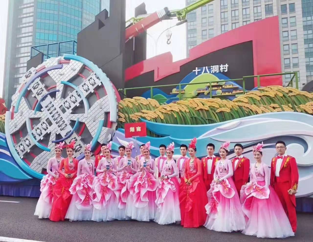 “潇湘今朝”彩车上,湖艺学子以变幻的芙蓉花造型配合彩车的整体设计,尽显湖南的创新引领风貌。自接到展演任务后,同学们服从指挥、刻苦训练,时刻铭记“德艺双馨,敢为人先”的校训精神,在每天八九个小时的紧张排练中克服困难、精益求精,最终不辱使命,以专业精湛的表演为湖南方阵增色添彩!