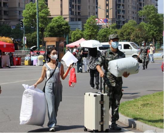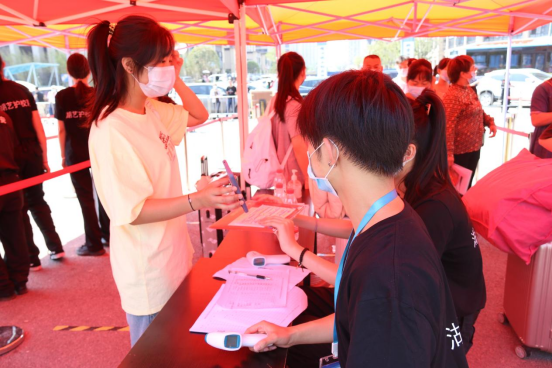 经过免洗消杀、测查体温、验证健康码、核对身份信息等多重“安全关卡”,新生们有序进入校园。