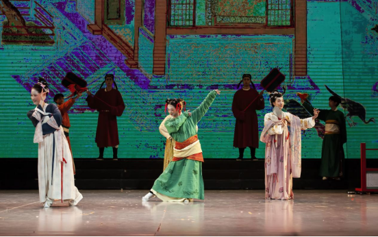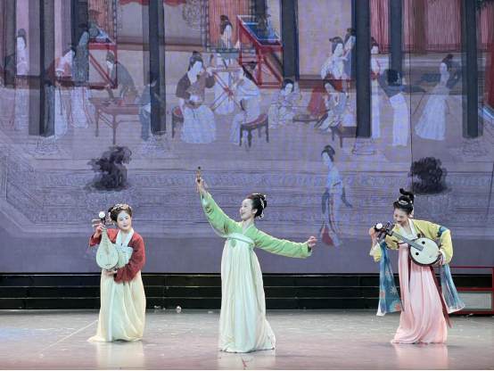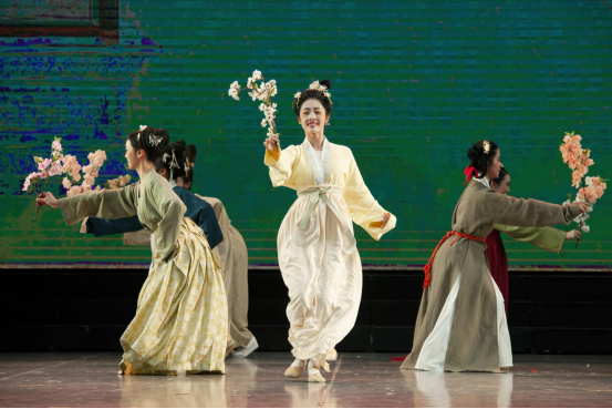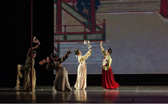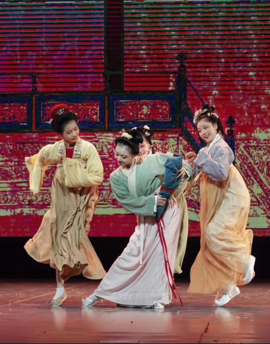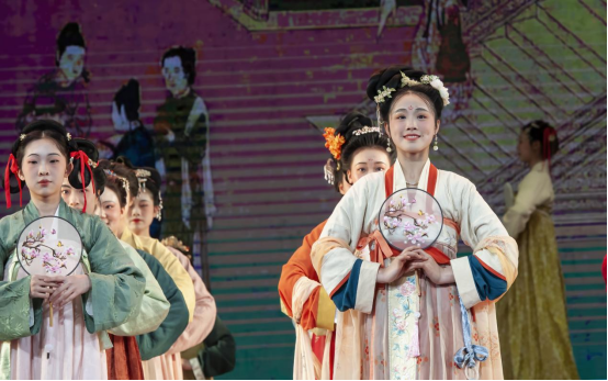 特别是,此次展演创造性地采用沉浸式人物造型艺术,借助舞台表演的方式,将中国古代传世名画《汉宫春晓图》活灵活现地“复刻”出来,画中人仿佛“出画入戏”一般,演员们优美的身姿、极富古韵的造型、灵动飘逸的表演,让人更直观地领略到汉代宫廷春色满园的浪漫景象。