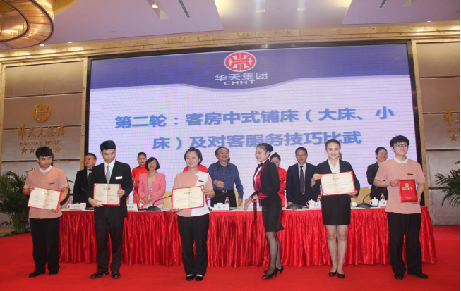 4月-5月,华天集团举办了2017年华天酒店业“创新·匠心·温馨”技能竞赛,共有31支代表队,801名选手参加了16个项目的预赛。我院社文系14级酒店管理专业许娜(客房服务员岗位实习)、邹依婷(客房服务员岗位实习)踊跃报名,在预赛中重重突围,顺利进入决赛,最终许娜荣获客房中式铺床及对客服务技巧(大床)第一名、邹依婷荣获客房创意小景布置第二名,为酒店团体总分贡献了不菲力量。
