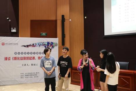 讲座中,陈福云以《新化山歌的起源、特点及传播》为题,用通俗生动的语言介绍了新化县的历史文化环境、新化县与梅山文化的关系、新化山歌与巫歌的关系、新化山歌的特点、新化山歌的文学艺术性、新化山歌的传播,并带领大家一同赏析了山歌演唱视频。讲座现场,她用清唱的方式向在场师生展现了新化山歌的独特魅力,并邀请同学们一同演绎了新化山歌经典曲目《姣莲爱我我爱她》,让同学们亲身感受了新化山歌的艺术魅力。整场讲座掌声不断、喝彩连连,陈福云表示,希望更多的年轻人能够了解、热爱、传承新化山歌,让作为民族艺术文化瑰宝的新化山歌永葆活力、代代相传。