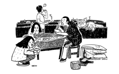 近日,设计艺术学院教师聂敦格创作的漫画《和猪抢食》《韭菜买生菜》被人民日报漫画增刊《讽刺与幽默》采用发布。