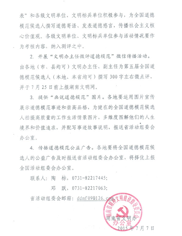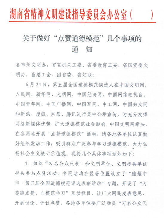 为充分发挥网络新媒体优势,扩大道德模范社会影响,中国文明网等相关网站对第五届全国道德模范候选人进行集中公示宣传,并开展“点赞道德模范”活动。现将省文明办《关于做好“点赞道德模范”几个事项的通知》转发给你们,请认真贯彻执行。