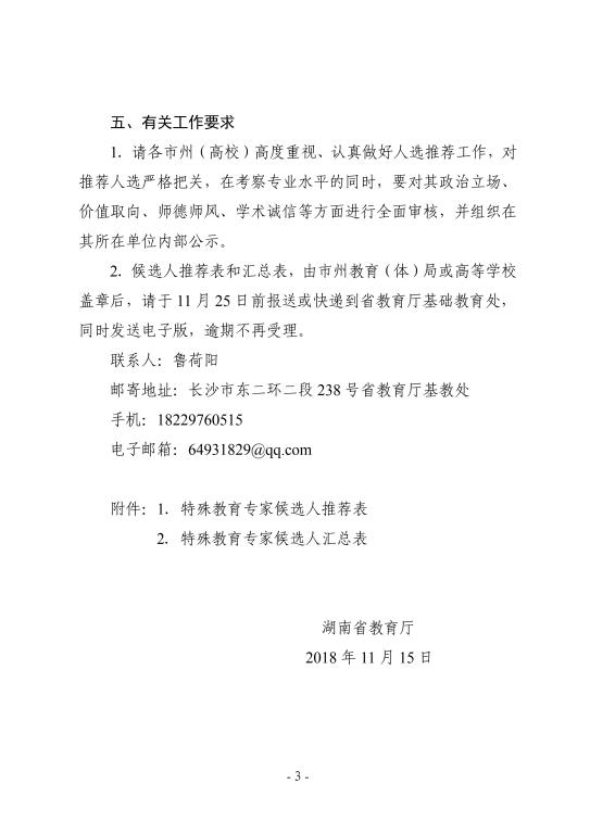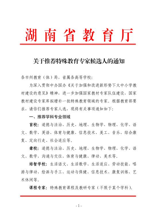 现将湖南省教育厅《关于推荐特殊教育专家候选人的通知》转发给大家。具体文件后附。